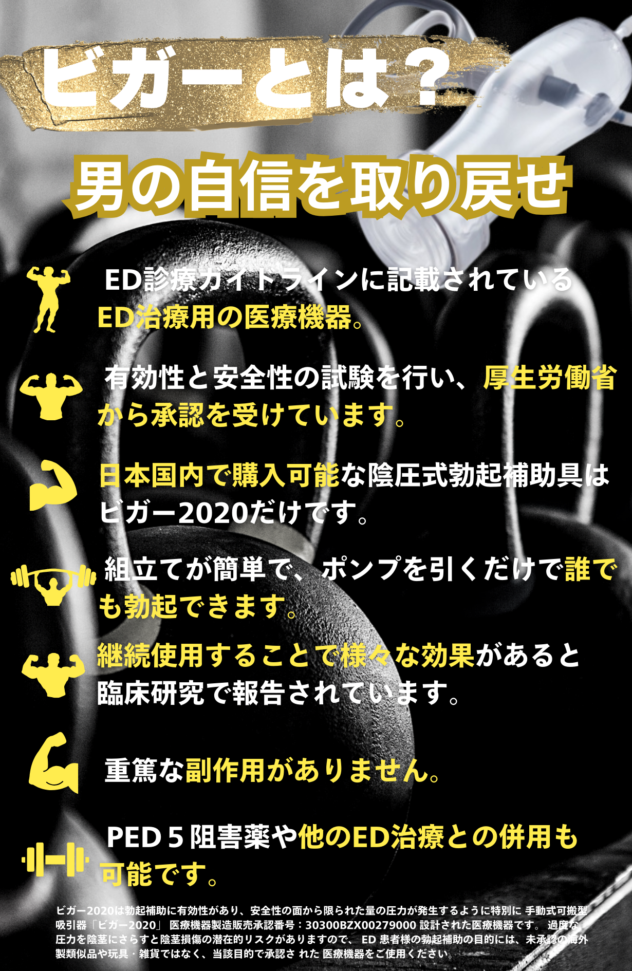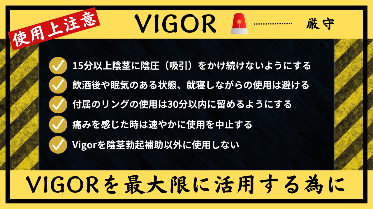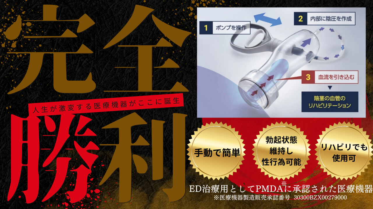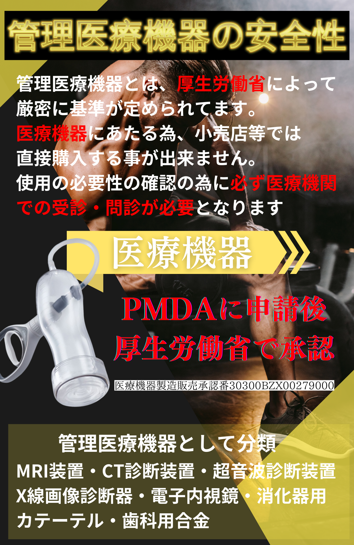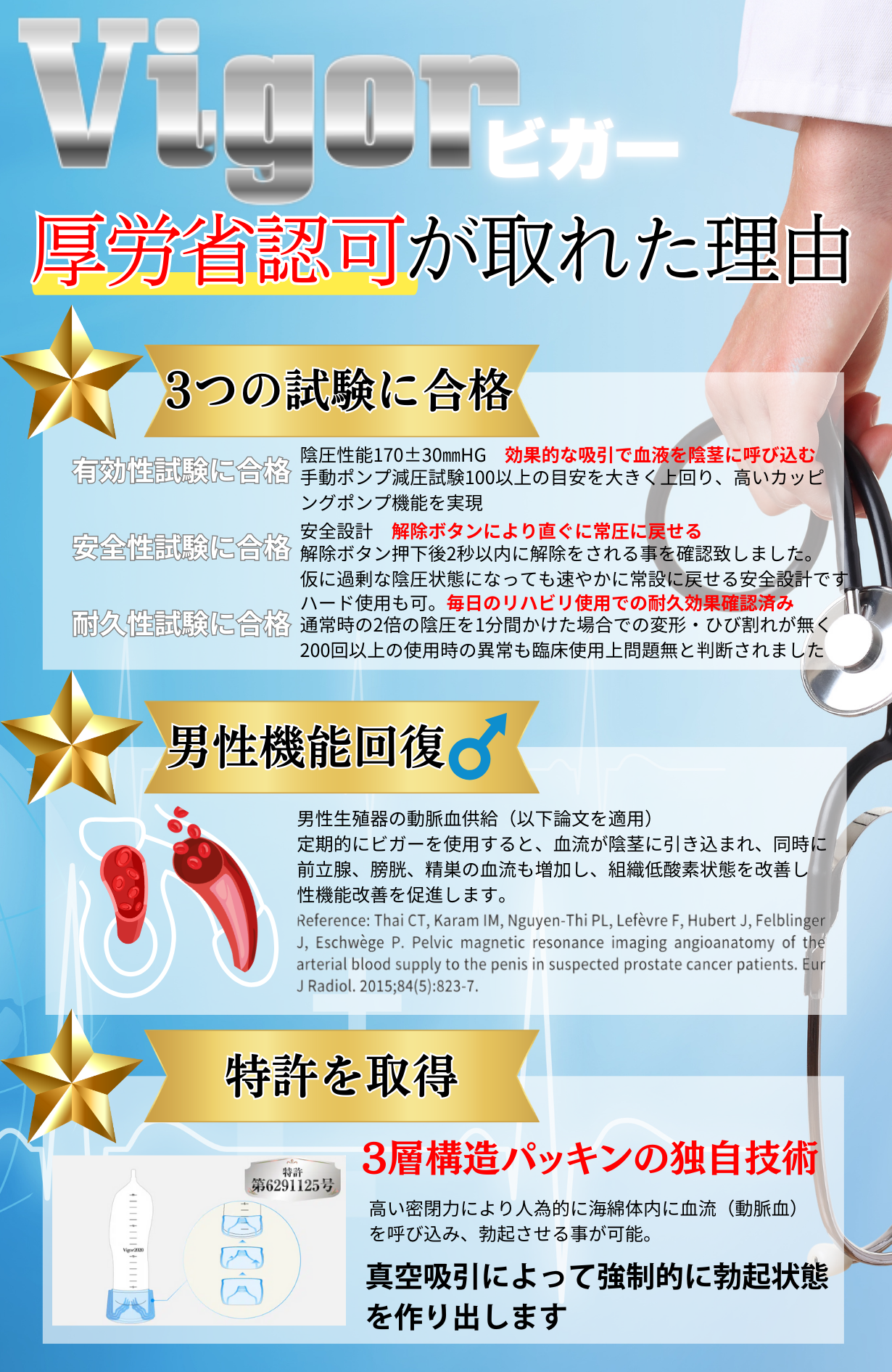 Vigorとして臨床試験を行い学会発表を行っております。この時の対象は27名の中程度EDの患者様を対象としておりますが、1年間の追跡期間を通して副作用は報告されておりません。陰圧式勃起補助具として報告されている副作用として陰茎痛、皮下出血、陰嚢吸引、冷たい勃起時などが報告されております。また、サンプル使用者に、取り外しの際の疼痛が報告されておりますが、取り外しの手順を守っていただければ問題なく使用できると考えております。今までの報告として、吸引時、取り外し時の痛み、30分以上吸引することによる陰茎の浮腫や内出血などが報告されています。吸引時や、取り外し時の痛みはパッキンを重ねる枚数を調整する。弱い圧から使用し継続使用するなどにより改善すると報告があります。